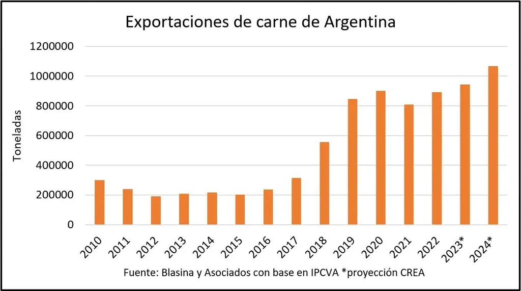 Después de un año de exportaciones récord en 2023, proyectadas en 940 mil toneladas al cierre de diciembre y con una facturación de unos US$ 4.000 millones, con el cambio de gobierno y las condiciones que se espera que tengan los exportadores, la expectativa es que ese volumen sea el piso para 2024. El techo se ubica en 1,065 millones de toneladas unas 125 mil más según las proyecciones de CREA.