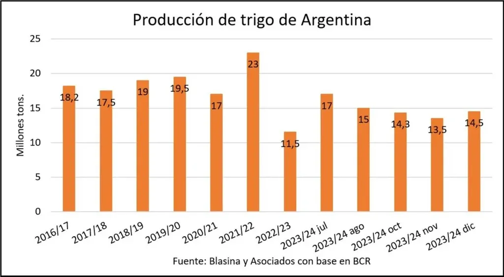 Según los datos de la Bolsa de Cereales y de la Bolsa de Comercio de Rosario, con proyecciones de poco más de 14 millones de toneladas en trigo y 100 millones de toneladas entre soja y maíz, se calcula que ingresen entre US$ 38.000 y US$ 40.000 millones por la cosecha de los principales granos y sus derivados en 2024.