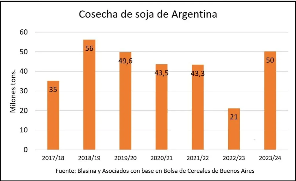 Pero en el balance cabe esperar un aumento en la oferta de granos, tanto del que está embolsado como el de las cosechas futuras que se estiman entre 48 y 50 millones de toneladas de soja, 45 millones de toneladas de maíz y 14,5 millones de toneladas de trigo.