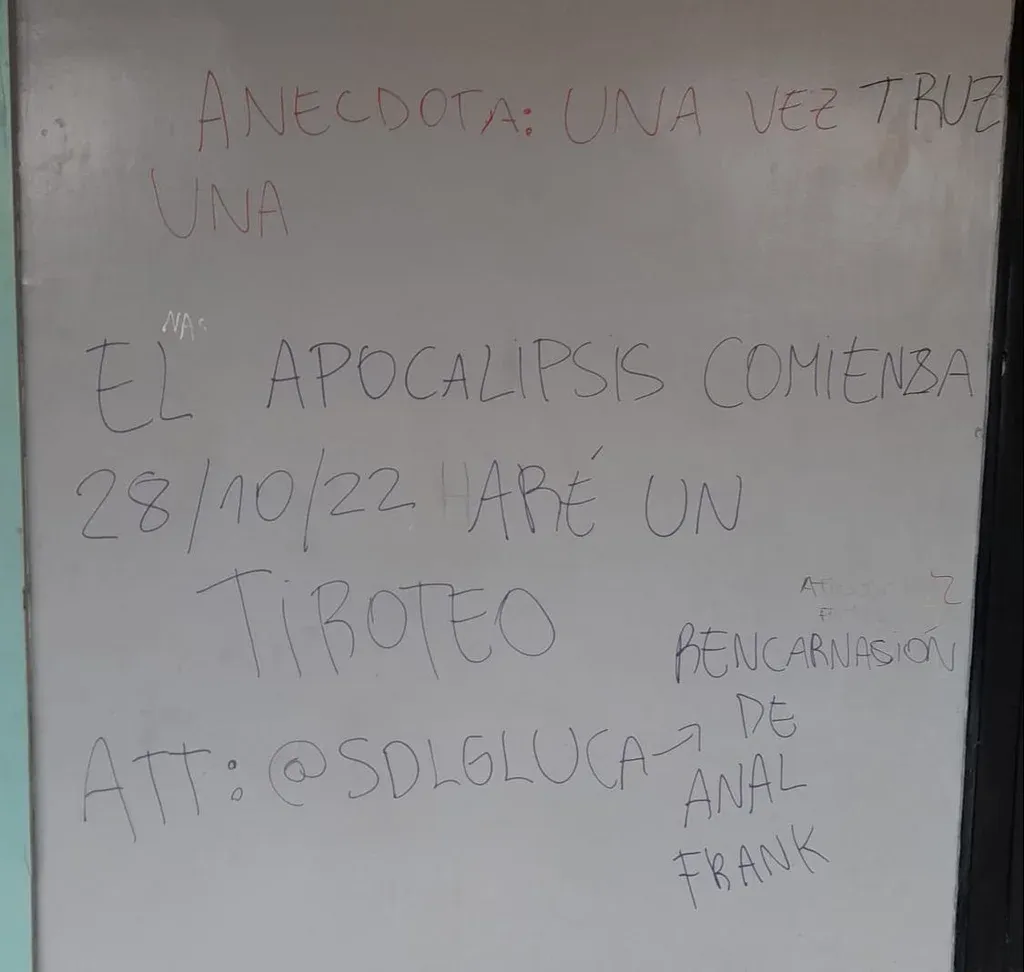 Un salón de un grupo de 3° año amaneció este martes con una amenaza de tiroteo en una pizarra: "El apocalipsis comienza 28/10/22: haré un tiroteo".
