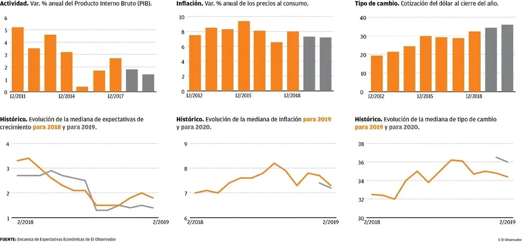 Estas expectativas para el tipo de cambio vienen en caída en los últimos meses. En enero, la mediana de los expertos esperaba que el año cerrara con un dólar a $ 34,8, en diciembre preveía una cotización de $ 35 y en setiembre, de $ 36,2.