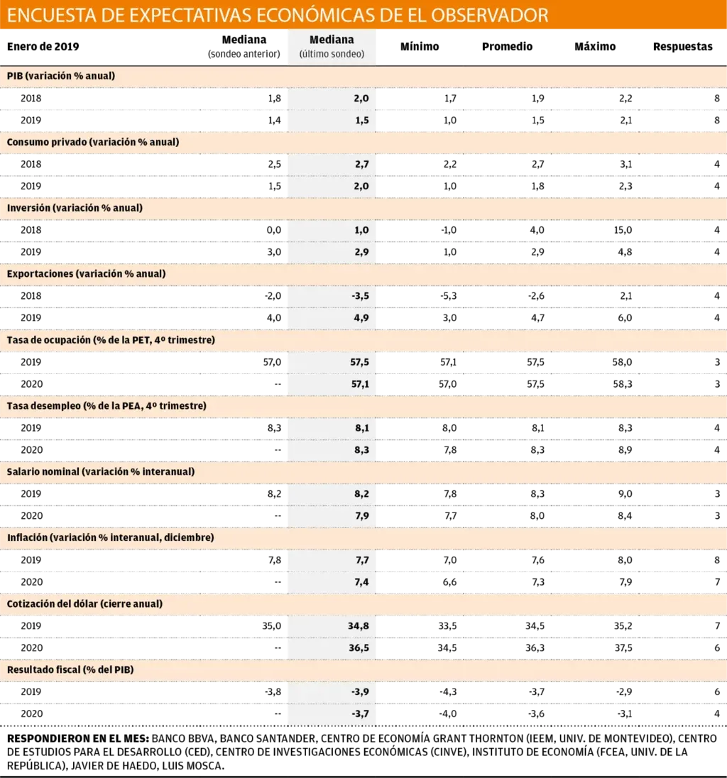 Durante el último año –dato que se conocerá en marzo–, la mediana de los analistas proyecta que la economía uruguaya creció 2%, dos décimas por encima de la proyección de diciembre. Para este año, las estimaciones mejoraron en una décima, a 1,5%.