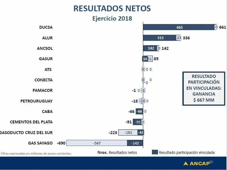 De acuerdo a la presentación del balance, el grupo ANCAP-incluyendo subsidiarias- cerró el ejercicio 2018 con un resultado operativo positivo de US$ 163 millones. Eso fue contrarestado por pérdidas financieras de US$ 82 millones, asociadas al endeudamiento comercial y financiero en moneda extranjera. En tanto, las empresas vinculadas al grupo aportaron ganancias de US$ 21 millones en el último ejercicio.