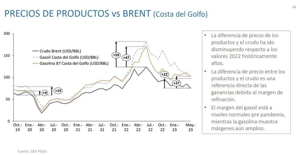Tras registrar valores históricamente altos en 2022, los márgenes de refinación han comenzado a disminuir. Hoy el margen del gasoil está en niveles normales prepandemia (unos US$ 22 por barril), mientras que la gasolina muestra márgenes que todavía se consideran amplios (alrededor de US$ 27 por barril).
