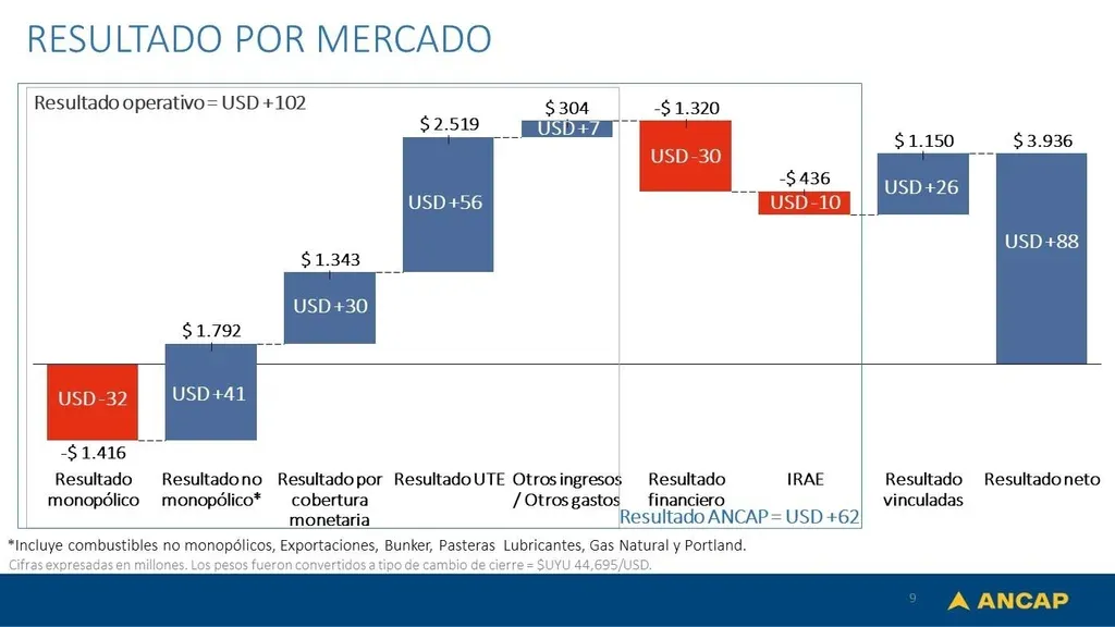 De acuerdo con la presentación del balance, Ancap cerró el año con un resultado operativo positivo de US$ 102 millones. Eso fue contrarrestado por una pérdida financiera de US$ 30 millones. En tanto, las sociedades vinculadas al grupo aportaron ganancias por US$ 26 millones, y contabilizando otros US$ 10 millones de resultado por Impuestos a la Renta (IRAE), el resultado global fue positivo en US$ 88 millones en el año.