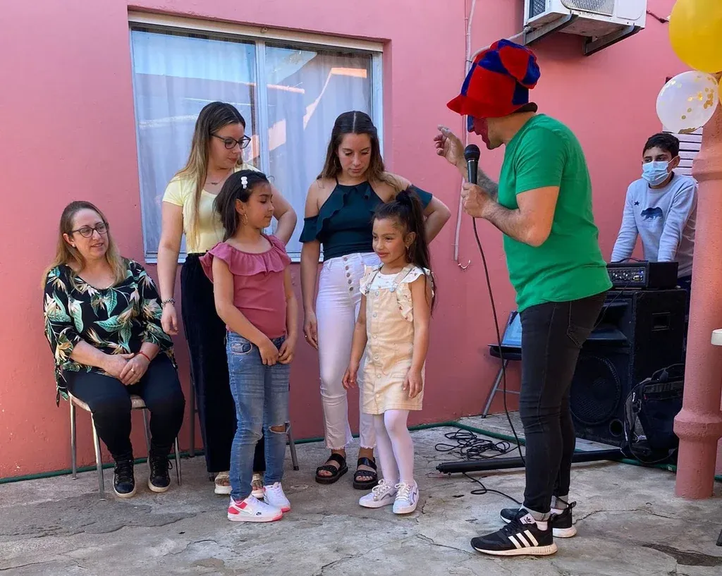 Martín contó que en 2012 se inició en el tema animación de fiestas. Primero hizo una inversión en camas elásticas, inflables, máquina de copos algodón, equipos de música y máquina de burbujas, por ejemplo. Cuando la competencia de ese servicio creció dio un giro: aprovechó sus experiencias en murga joven y teatro para crear un personaje y llegar maquillado y disfrazado a las fiestas para entretener tanto a los niños como a los mayores. También eso dio paso a performances de stand up y tan bien le fue que aprovechando que hacía hasta 20 trabajos de viernes a domingo generó los recursos para cumplir el sueño de la casa propia.