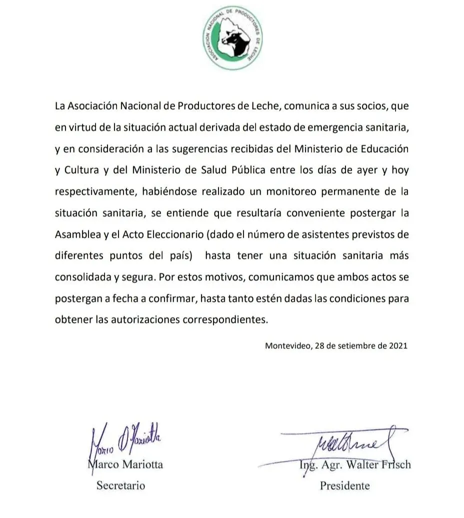 La Asociación Nacional de Productores de Leche (ANPL) comunicó su decisión de postergar la asamblea y el acto eleccionario, instancias que en condiciones normales debieron realizarse en el otoño de este año, "en consideración a las sugerencias recibidas del Ministerio de Educación y Cultura y del Ministerio de Salud Pública", según se expresa en un comunicado remitido a El Observador en la tarde de este martes 28 de setiembre.