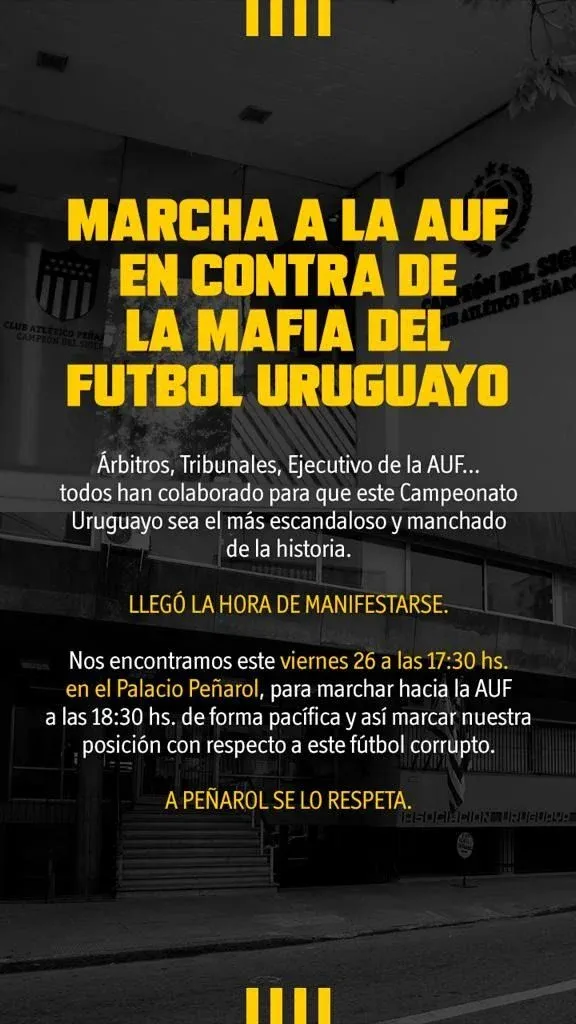 "Marcha hacia la AUF en contra de la mafia del fútbol uruguayo", se titula la invitación, que agrega]: "Árbitros, tribunales, Ejecutivo de la AUF... todos han colaborado para que este Campeonato Uruguayo sea el más escandaloso y manchado de la historia. Llegó la hora de manifestarse".