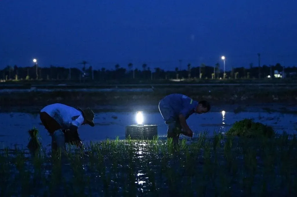 A las tres de la mañana, arroceros y arroceras avanzan en la oscuridad, agachados, con una lámpara en la frente y los pies en el agua, sembrando