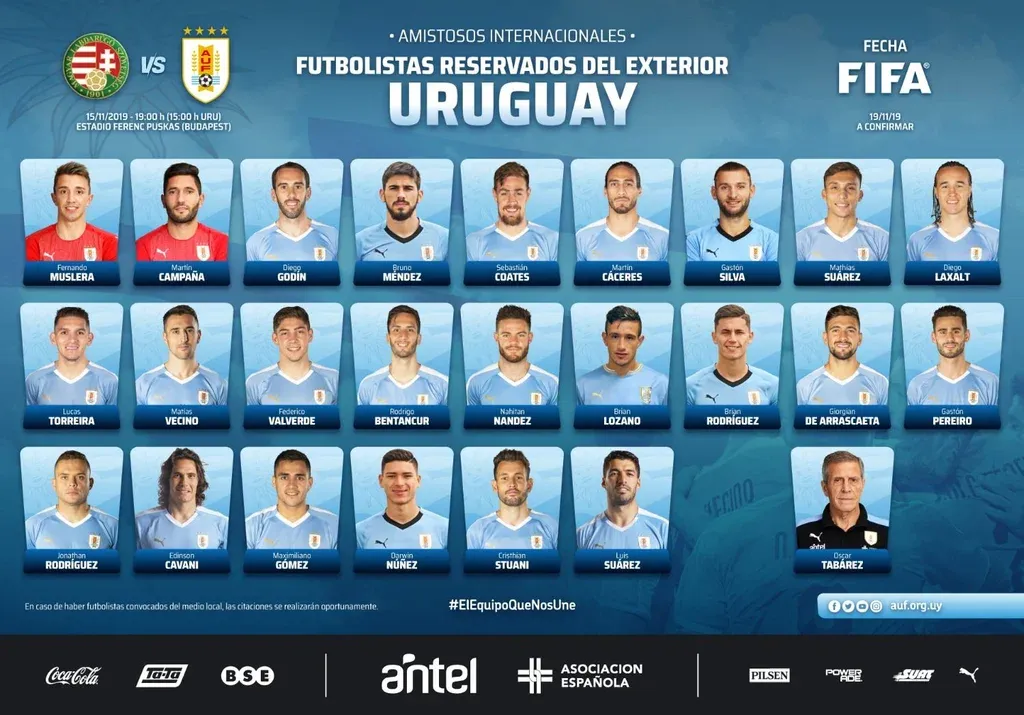 La lista de Tabárez la integran 24 jugadores y se producen los regresos de Luis Suárez y Edinson Cavani, ausentes en los partidos de octubre ante Perú.