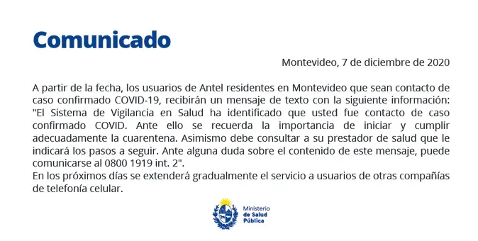 Antel activa SMS que avisará a sus usuarios con un mensaje personalizado si tuvieron contacto con algún positivo de covid-19 y que llama a "cumplir adecuadamente" la cuarentena, anunció el Ministerio de Salud Pública.