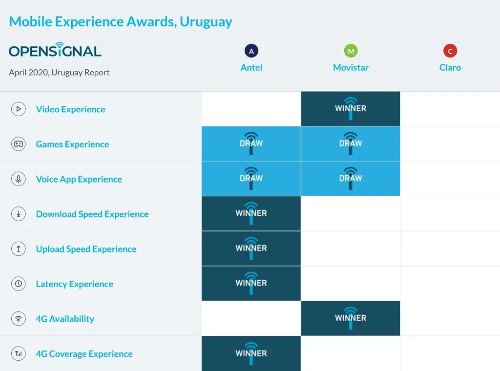 Antel, Claro y Movistar son las tres compañías que ofrecen internet móvil en Uruguay.Todas ellas son analizadas por diferentes consultoras para informar la calidad de su servicio. Una de ellas es Open Signal, que los mide en diferentes rubros.