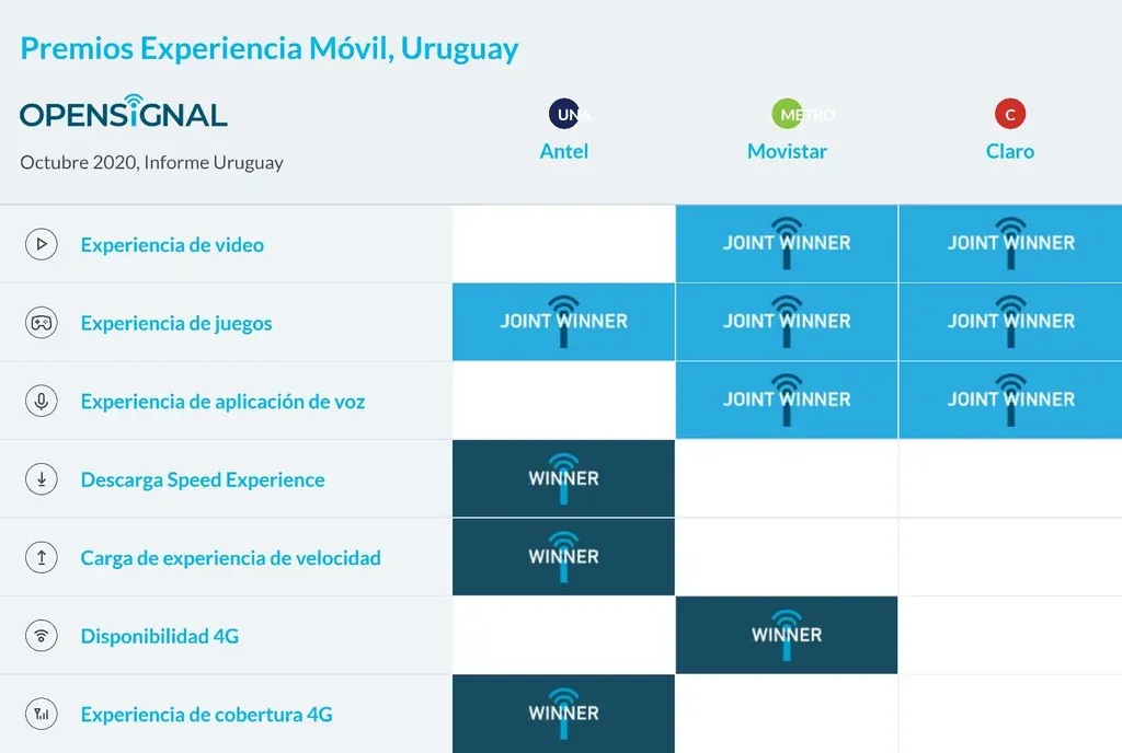Movistar es el ganador en los rubros: experiencia de juegos junto Antel y Claro; y aplicaciones de voz y video junto a Claro.