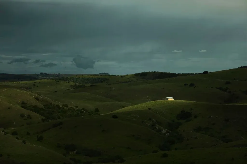 El día que tomé esta foto nos dirigíamos de Punta Ballena a Villa Serrana con una amiga por la ruta 60. El cielo cargado de nubes parecía indicar una tormenta inminente. Recorrimos casi todo el trayecto con una suerte de apuro para escapar a la lluvia torrencial, pero cuando vimos esta casita sola en medio de las sierras decidimos detenernos a fotografiarla a pesar del cielo gris, que no prometía una gran vista. Apenas terminé de encuadrar y justo antes de tomar la foto, salió el sol y la iluminó, solo a ella.