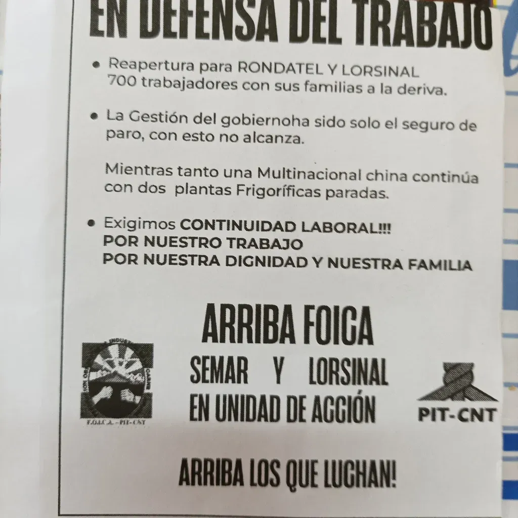 Este jueves 19, en Rosario, habrá un plenario extraordinario de trabajadores de la industria frigorífica y también una movilización donde se encuentran las rutas nacionales 1 y 2, todo relacionado con el problema que tienen los empleados del frigorífico Rondatel SA –ubicado en las afueras de esa ciudad en Colonia–, perteneciente a una empresa china e inactivo desde en los últimos meses.