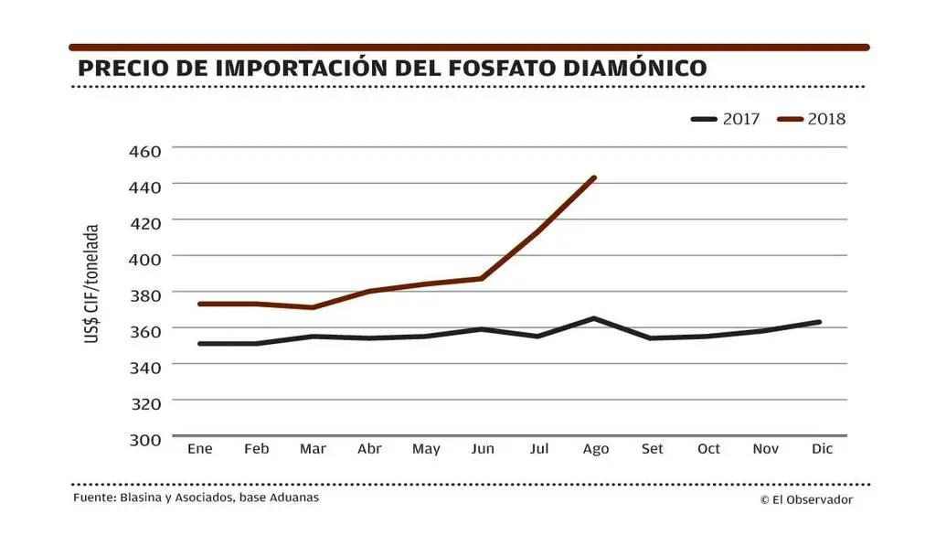 El fosfato monoamónico (MAP) y el fosfato diamónico (DAP) ocupan el segundo y tercer puesto en las importaciones, con una participación del 12% (61.426 toneladas) y 10% (47.360 toneladas) sobre el total del volumen, respectivamente. En agosto el promedio del MAP fue de US$ 456, un 35% más que los US$ 337 de un año atrás. El precio promedio del DAP fue de US$ 443, 18% superior que los US$ 365 en igual período de 2017.