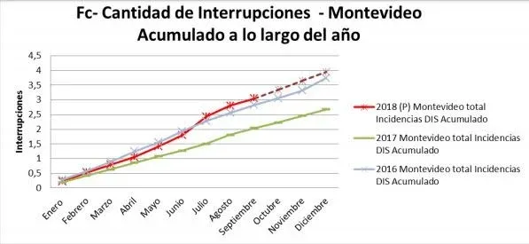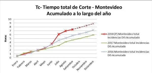 En el informe publicado este martes en el sitio web del ente, se indica que en los últimos años los clientes de Montevideo "no han llegado a los cuatro cortes ni a las 7 horas de interrupción acumulada en el año". La previsión para 2018 es que "difícilmente se superen los cuatro cortes". Sin embargo, UTE informó que el promedio de horas sin el servicio "superará ampliamente" las 8 horas.