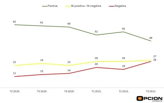 La valoración positiva llega en agosto a su piso (46%), aunque viene decreciendo desde la primera medición, en el segundo trimestre de 2020, cuando alcanzó el 62%.