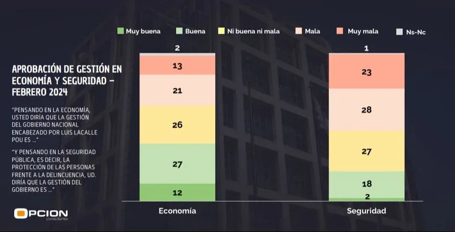 La aprobación de la gestión del presidente Luis Lacalle Pou creció tres puntos respecto a la última medición (noviembre), mientras que la desaprobación bajó cinco puntos (pasó de 32% a 27%), según la última encuesta de la consultora Opción presentada este viernes en Telenoche (Canal 4).