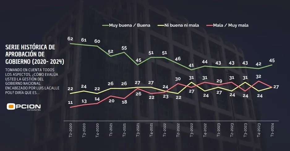 Según la investigación, en el primer trimestre de 2024 la aprobación del mandatario fue de 45%, mientras que la desaprobación alcanzó 27%. Quienes consideraron que la gestión no es ni buena ni mala también fueron 27%.