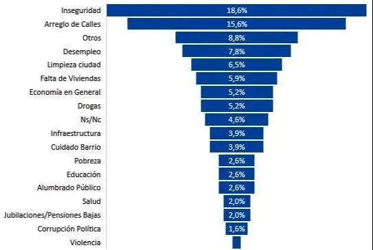 Más abajo en la consideración, alrededor del 8% considera que el desempleo el principal problema, el 6,5% menciona a la limpieza de la ciudad mientras que el 6% cree que el principal problema es la falta de viviendas.