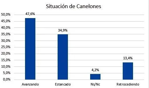 Por el lado de la situación general de Canelones, más del 47% considera que el departamento está avanzando, el 35% considera que está estancado mientras que el 13% considera que está retrocediendo.