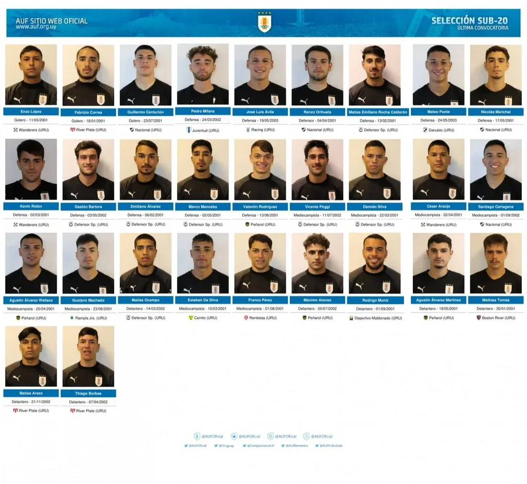 AUF Mancebo y Tomás Y los atacantes son Agustín Álvarez Martínez (Peñarol), Matías Arezo (River Plate), Thiago Borbas (River Plate), Mathías Toma (Boston River) y Rodrigo Muniz (Deportivo Maldonado).