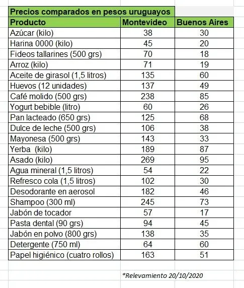 Las diferencias de precios son también grandes en los alimentos y productos de primera necesidad. De hecho hasta antes de la pandemia en departamentos del litoral como Paysandú y Salto los lugareños cruzaban a las localidades vecinas para hacer sus compras. A mediados de agosto comerciantes uruguayos advirtieron que el cierre de fronteras empujó una recuperación de las ventas en los supermercados locales .