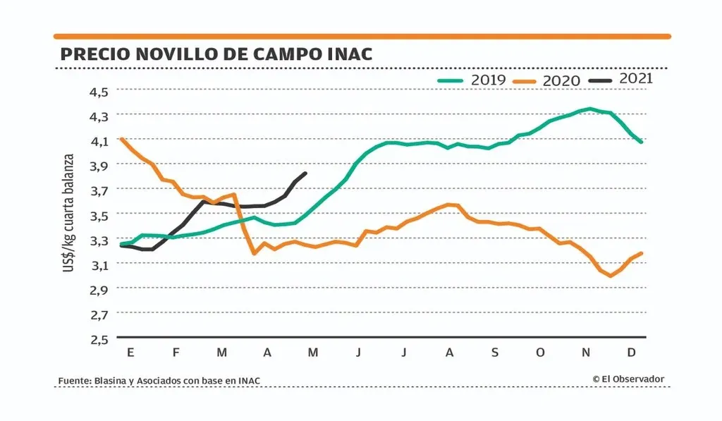 En Uruguay los mejores novillos gordos de pasto alcanzan los US$ 4 por kilo de carcasa y eso hace crecer la expectativa rumbo a la poszafra de la primavera, período habitual de precios máximos. Cada vez más este año se va pareciendo a lo que podría llamarse “volver a 2019”, cuando el anterior récord de precios del ganado en Uruguay. Incluso con precios aún más altos que entonces. La primera zafra de terneros de tres millones es recibida fluidamente por los invernadores. Producir más no altera a los precios. Aunque la relación de reposición es muy favorable al invernador, ningún criador queda descontento cuando vende su producto. Pero los precios tan altos de aquel año no terminaron bien.
