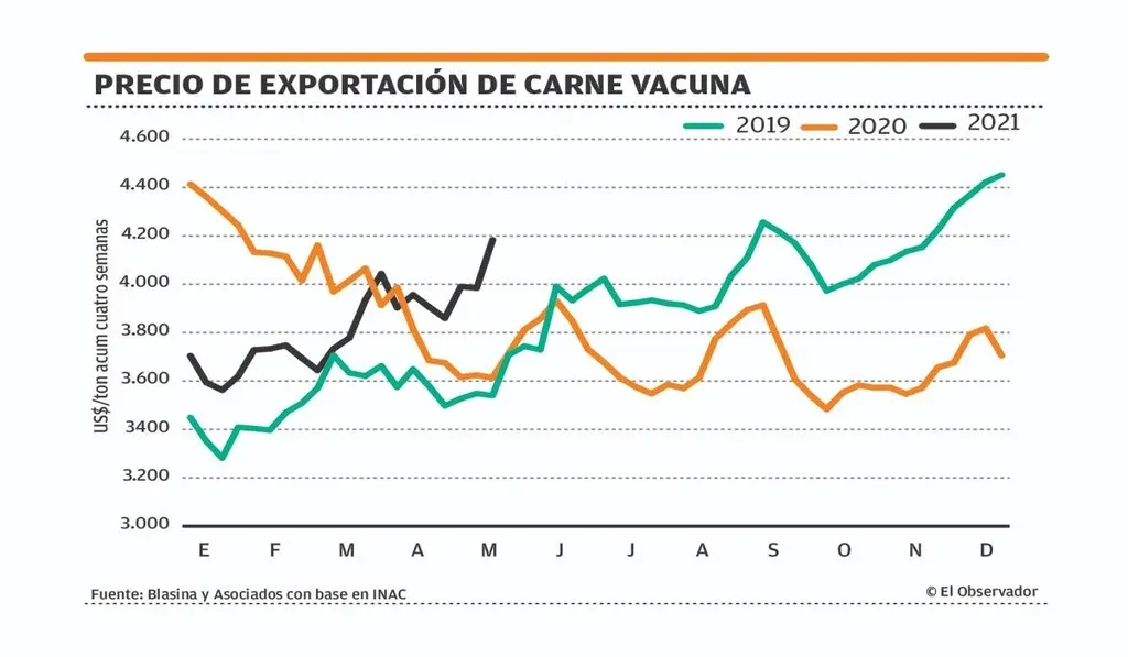 El precio de exportación de la carne vacuna uruguaya lo expresa. El precio promedio ha superado los US$ 4.000 por tonelada en cuatro de las últimas cinco semanas y en las últimas dos superó los US$ 4.400, algo muy inusual. El precio promedio en lo que va del año alcanza los US$ 3.877 por tonelada. Respecto a 2019 los precios son US$ 300 más altos.