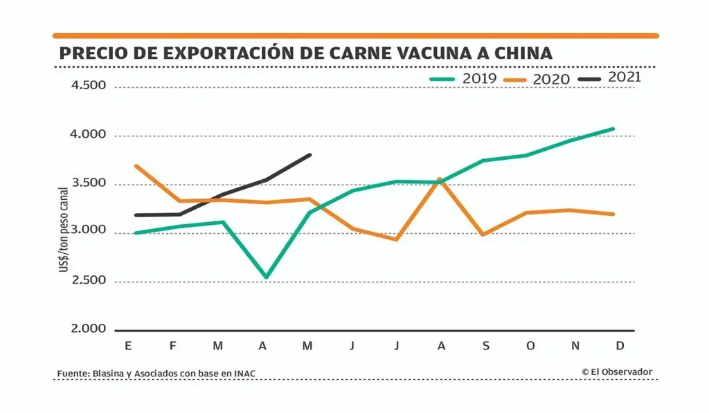 La tonelada de carne a China alcanzó en lo que va de mayo máximos desde diciembre de 2019 –cuando comenzó el auge de precios como consecuencia de la primera ola de peste porcina africana–. Promedió los US$ 3.807 la tonelada, US$ 500 más que en mayo de 2020 y US$ 600 por encima que en 2019.