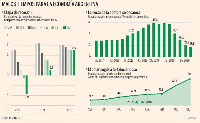 El FMI prestará a Argentina US$ 50.000 millones a cambio, eso sí, de una serie de medidas de austeridad que buscarán lograr una estabilidad económica que le sigue siendo esquiva al país. A finales de julio, el organismo multilateral que dirige Christine Lagarde redujo las previsiones de crecimiento para Argentina desde el 2% que había augurado apenas tres meses atrás hasta el 0,4%. Esta misma semana, el Banco Central argentino, en su último boletín REM (Resultados del Relevamiento de Expectativas de Mercado), pintaba un futuro aún más negro para el Producto Interior Bruto (PIB) del país.