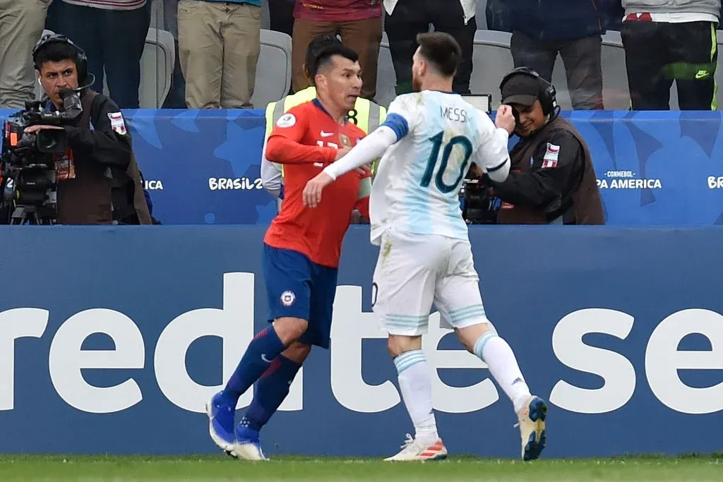 AFP Y sobre los 37 minutos, Gary Medel pechó dos veces a Lionel Messi luego de una jugada sobre la línea de fondo chilena y el árbitro decidió expulsarlos a los dos. La expulsión del argentino no quedó para nada clara, ya que no reaccionó a los pechazos de su rival.