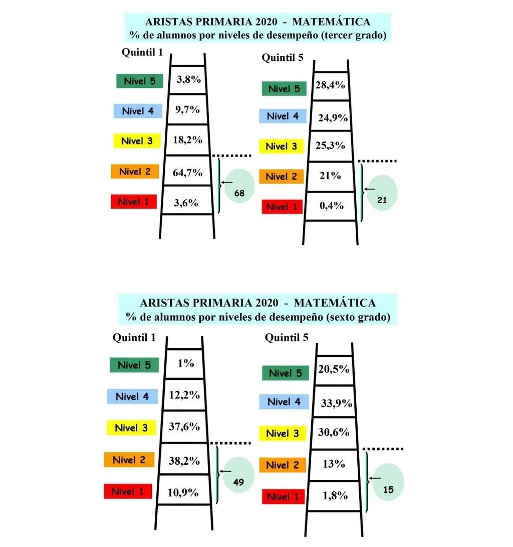 Tercer grado (matemática): Para matemática de tercero se definieron cinco niveles de desempeño. En el 2020 un 47% de los alumnos no superaron el nivel 2 de desempeño contra un 51% en el 2017. Cuando miramos los resultados según contexto socioeconómico y cultural del centro educativo, un 68,3% de los alumnos de tercer grado del contexto muy desfavorable no superaron el nivel 2 de desempeño (7 de cada 10 alumnos). Un 21,4% de los alumnos de tercer grado del contexto muy desfavorable no superaron el nivel 2 de desempeño (2 de cada 10 alumnos).