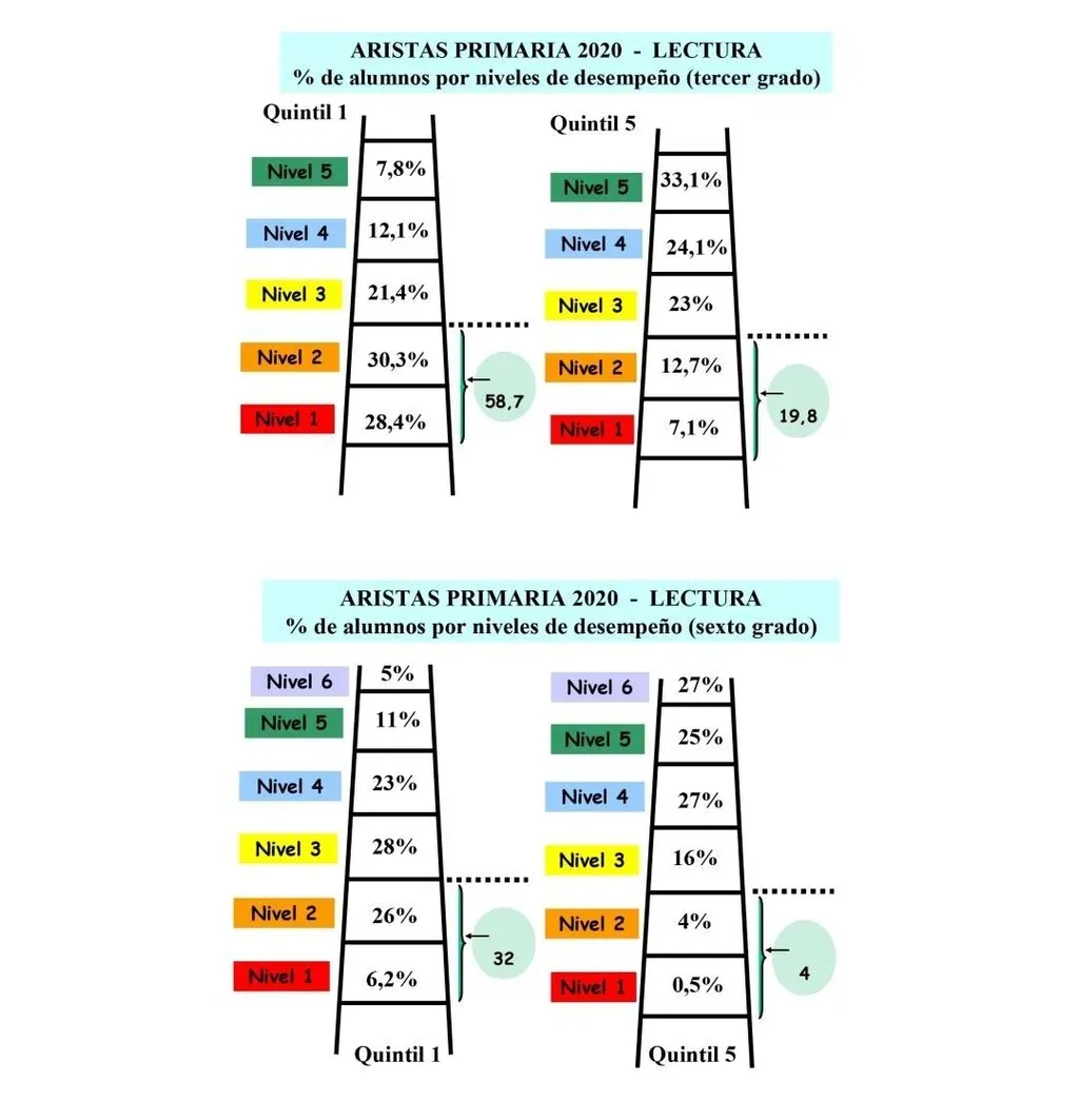 Sexto grado (lectura): Para lectura de sexto se definieron 6 niveles de desempeño. En el 2020 un 18,3% de los alumnos no superaron el nivel 2 de desempeño contra un 20% en el 2017. Un 32,3% de los alumnos de sexto grado de contexto socioeconómico y cultural muy desfavorable no superaron el nivel 2 de desempeño (3 de cada 10 alumnos). En el contexto muy favorable, un 4,5% de los alumnos de sexto grado no superaron el nivel 2 de desempeño (4 de cada 100 alumnos).