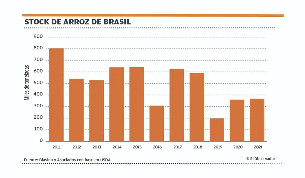 Eso puede generar un faltante de arroz interesante en el segundo semestre de este año. Y además los arroceros brasileños tienen una posición corporativa de no aumentar el área para sostener el precio, por lo que el área seguirá bajando el año próximo y será la más baja en 90 años en el país vecino.
