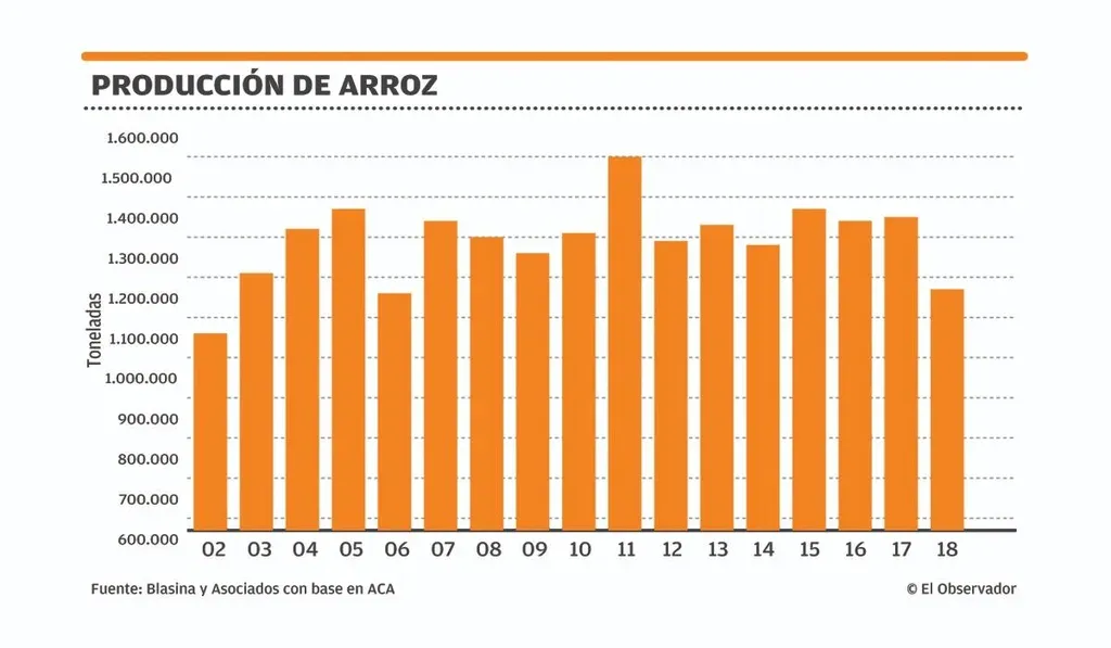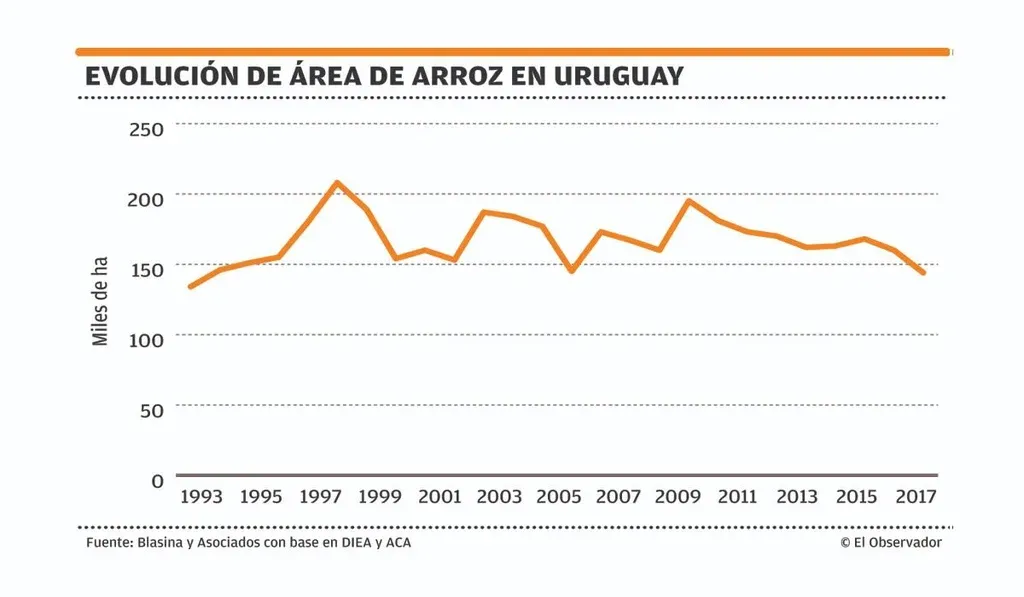 El sector –acosado por los costos elevados– hace seis años produce a pérdida, pese a los altos y estables rendimientos. Como consecuencia, la superficie sembrada bajó en la última zafra y se consolidó como la menor en 25 años. Para esta zafra la ACA estimó una superficie de 144.000 hectáreas, 16.000 menos que las 160.000 de la campaña anterior y una producción de 1,19 millones de toneladas, 7% menos que las 1,28 de la zafra pasada.