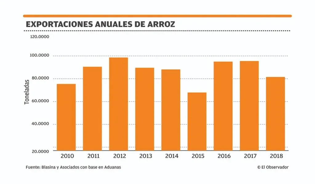La consecuencia es una caída del área, menor producción y por ende a una caída de las exportaciones ya que Uruguay exporta casi la totalidad del arroz que produce. En el primer trimestre de 2019 se llevan exportadas 182.287 toneladas, 35.290 menos (-16%) que las 217.577 toneladas del mismo período del 2018.