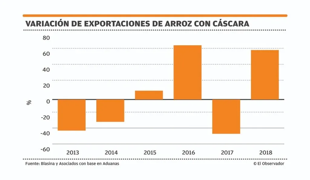 En 2018, las exportaciones de arroz con cáscara aumentaron un 62% respecto a 2017, hasta 67.532 toneladas, con una participación del 8% del total exportado.
