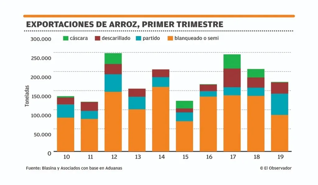 16% cayó la exportación de arroz desde Uruguay durante el primer trimestre de 2019 en relación al mismo período del año anterior.