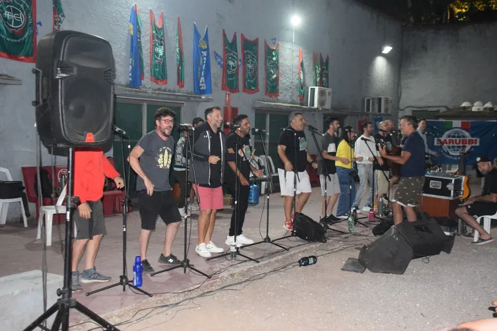 Los murguistas, a veces en rondas privadas, por momentos delante de una larga secuencia de micrófonos, ejercitan interpretando cuartetas, enlaces, gestos escénicos y otros contenidos. A algunas partes que exigen mucho al coro las repasan decenas de veces. Un par de muchachos mueven el libreto en el burro —así le dicen a una estructura de hierro que contiene un nylon donde se lee el libreto—. En un cuarto vecino, varias personas cosen aprontando trajes y sombreros. En la cantina la venta de choripanes, hamburguesas, papas fritas y hasta alfajores es un éxito. Así, durante cuatro o cinco horas, cada noche en ese local de La Aguada adornado por banderas de una decena de empresas que apoyan a la murga calientan las gargantas quienes cargan con la mochila de defender el título.