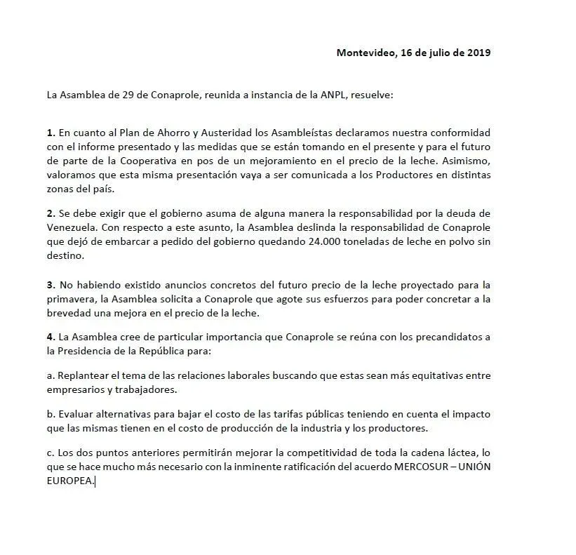 En segundo lugar, se exigió la toma de responsabilidad por parte del gobierno de la deuda que Venezuela mantiene con la cooperativa por US$ 30 millones, aunque no prosperó el planteo del titular de la ANPL de promover un juicio contra el estado venezolano por ese incumplimiento. El presidente del directorio de Conaprole, Álvaro Ambrois, ya había mostrado en lo previo su distanciamiento con esa postura, y apostó a seguir negociando con la cancillería y el Poder Ejecutivo para intentar cobrar ese pasivo.
