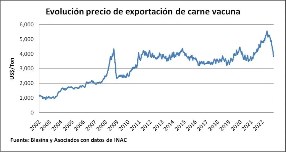 Mientras, la espera se hace difícil en todos los eslabones de la cadena cárnica. El precio de exportación de la carne vacuna y ovina cerró 2022 por debajo de los US$ 4.000 por tonelada, prácticamente en los precios del comienzo de la pandemia en 2020. En el caso de la carne vacuna para cuatro semanas móviles es el precio más bajo desde marzo de 2021.