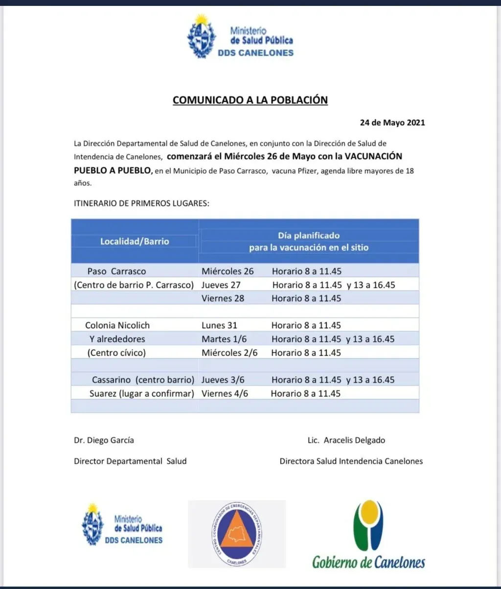 García emitió un comunicado este lunes para informar los lugares y horarios de vacunación en el departamento. Allí se vacunará el jueves y viernes en el centro de barrio de Paso Carrasco, el lunes 31, martes 1 y miércoles 2 se vacunará en Colonia Nicolich, el centro cívico de allí "y alrededores".