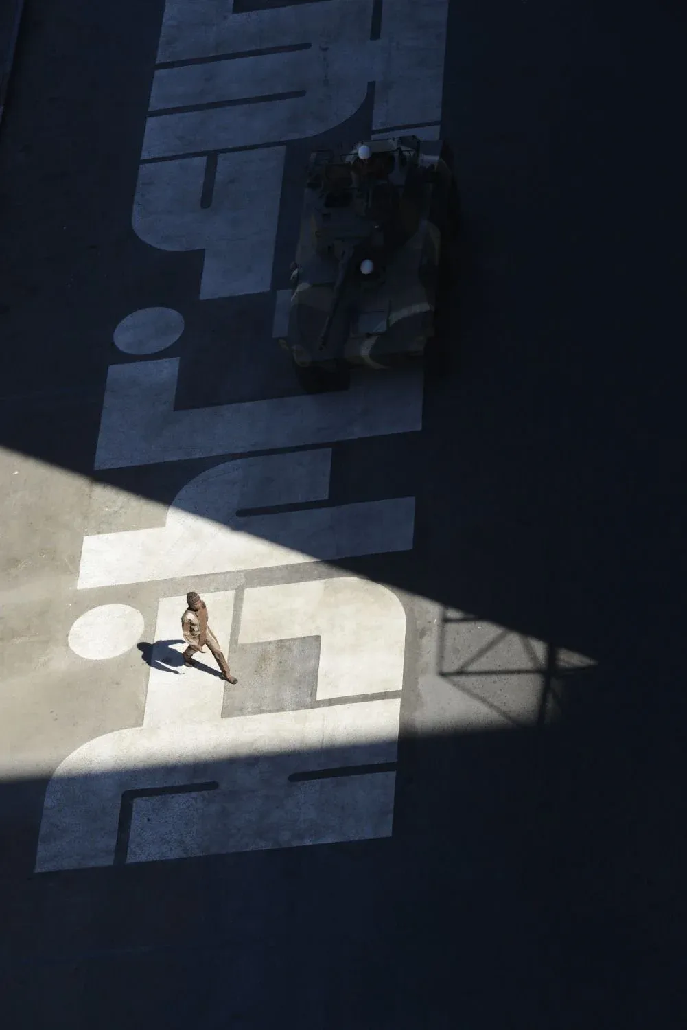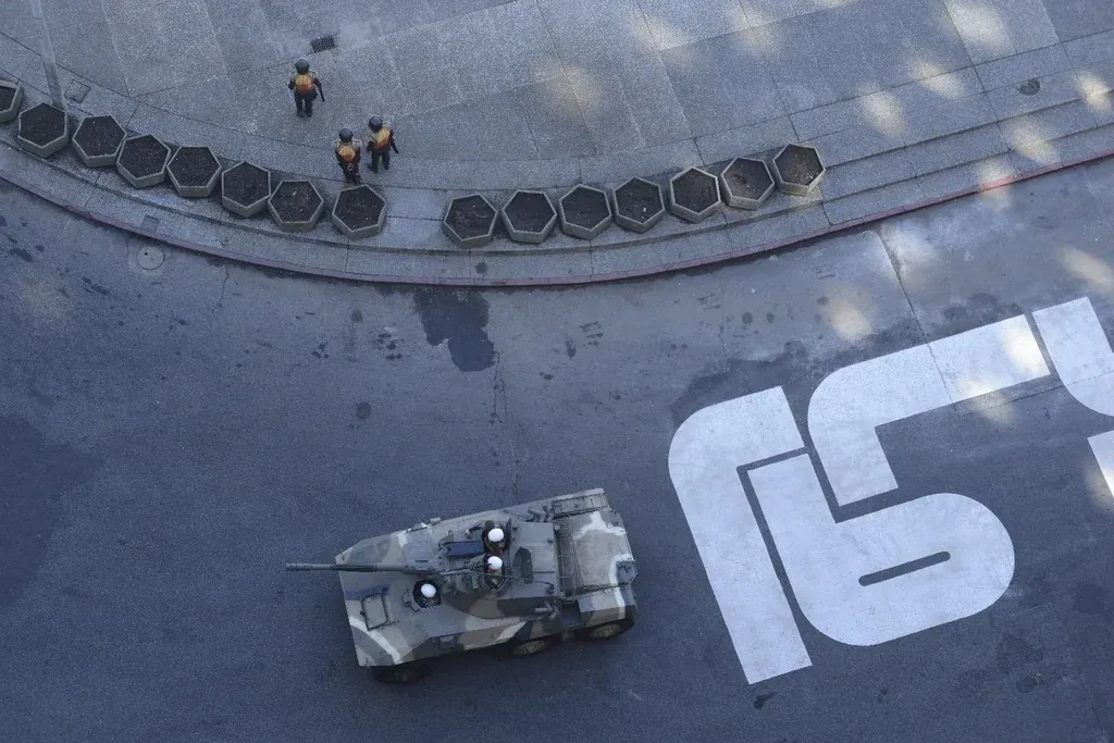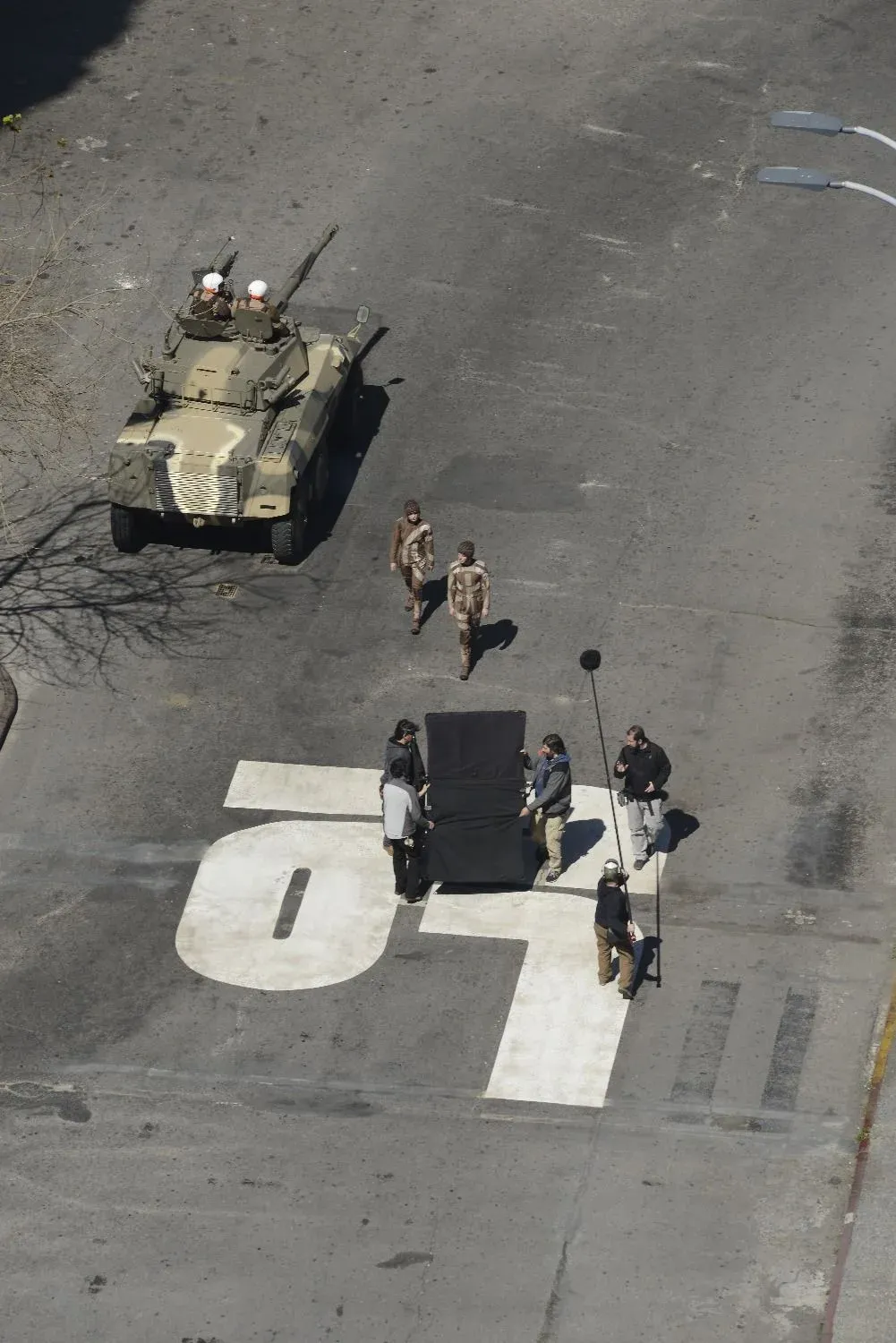 La cámara está sobre la calle de la plaza paralela a Juncal. Comienza una toma con los tanques y las camionetas verde musgo marchando una tras otra, dos militares que avanzan en diagonal hasta perderse y otros que los siguen por atrás. A medida que la cámara retrocede hacia el monumento en el centro de la plaza, comienzan a aparecer decenas de uniformados que caminan sin un patrón claro. Pasaron menos de 3 minutos y la toma terminó.