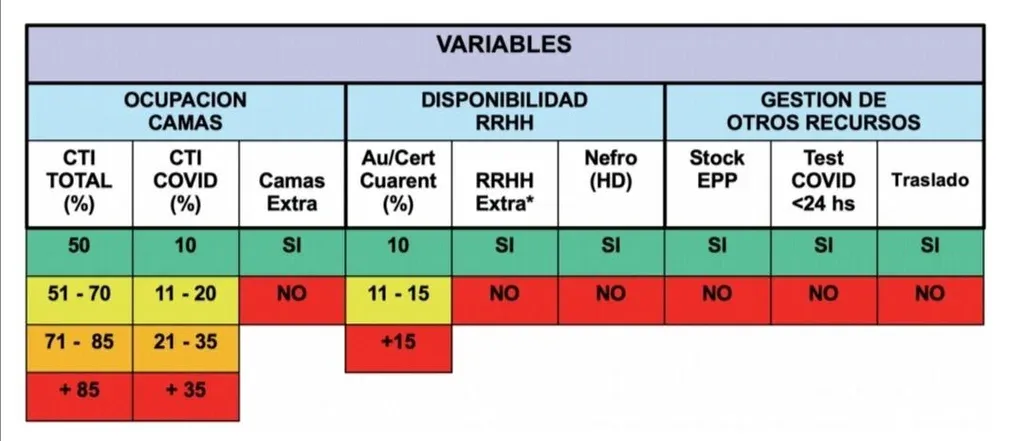 Una de las variables es la ocupación de camas en CTI, discriminando la cantidad total y los pacientes internados por covid-19. Si el porcentaje de camas ocupadas se ubica entre el 51% y 70%, se coloca en color amarillo, entre 71% y 85% es anaranjado y más de 85% implica la saturación. En esta variable también se incluye la capacidad de incluir camas extra.