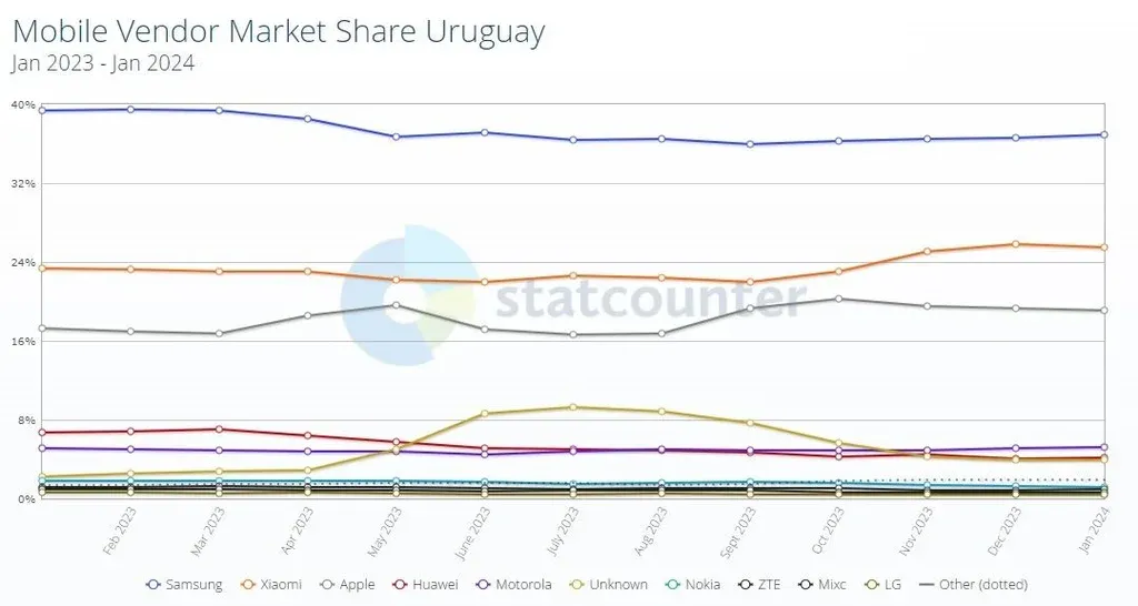 Xiaomi, por su parte, demostró ser la marca con el crecimiento más destacado. Empezó el año con 23.3% y lo cerró con un 25.5%, consolidándose como una opción con una fuerte preferencia entre los usuarios uruguayos.