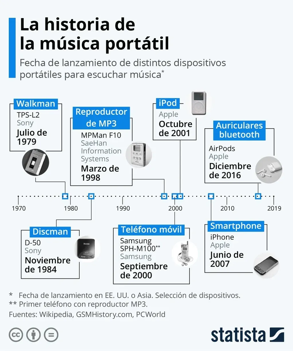 Esta infografía de Statista muestra algunos de los modelos de reproductores portátiles que han marcado un antes y después en los hábitos de consumo de música.