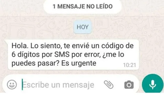 Desde un contacto, el usuario recibe de manera sorpresiva un mensaje por WhatsApp que dice: "Hola lo siento te envié un código de 6 dígitos por sms por error ¿me lo puedes pasar por favor? Es urgente". Al lado de eso, un emoji con un corazón, otro de una cara llorando de manera exagerada y uno último de una cámara de fotos.