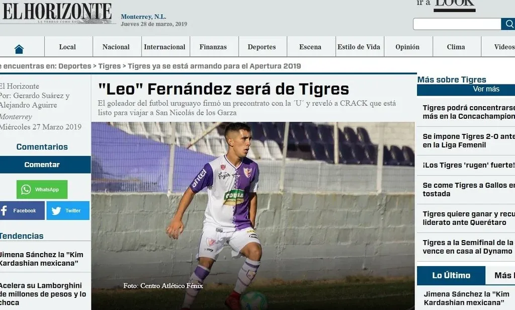 Leonardo Fernández, la joya de Fénix, figura y goleador del Torneo Apertura, acaparó las tapas de los principales diarios de Nueva León al anunciarse este jueves su llegada a Tigres que abonará US$ 800.000, que Fénix cobrará en cuatro cuotas entre 2019 y 2020.